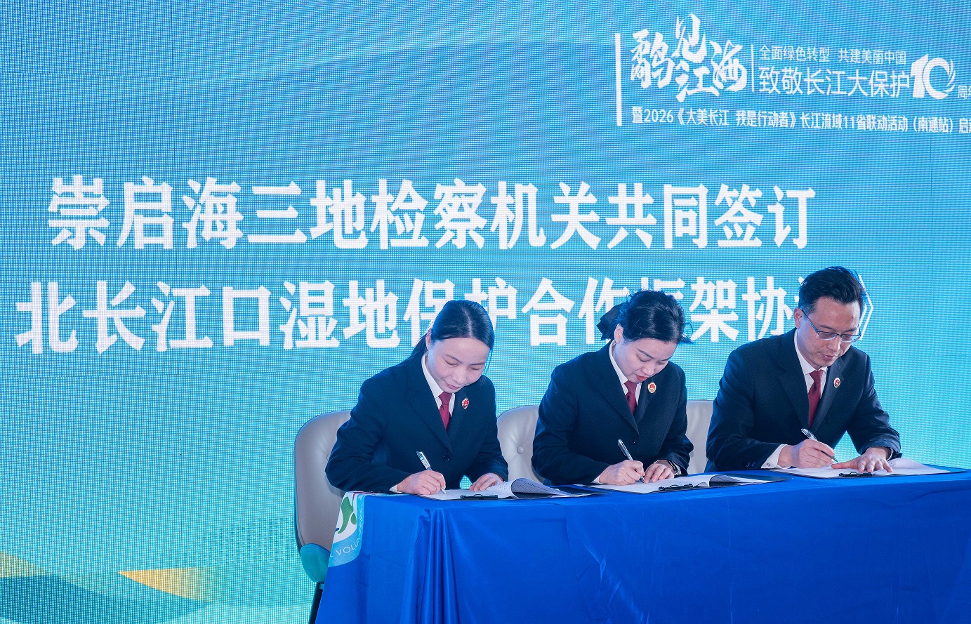 在长江大保护十周年之际,为凝聚跨区域生态保护合力,3月9日,启东市检察院在启东市长江口北支湿地生物多样性观测站举行长江大保护主题活动。活动现场,启东市检察院正式发布“检护长江口·鹬见潮汐树”公益诉讼检察品牌,崇明、海门、启东三地检察机关共同签订《北长江口湿地保护合作框架协议》,推动北长江口跨区域生态保护检察协作迈上新台阶。